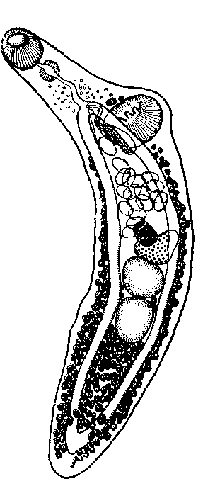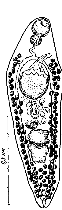 Яйца овальные, 0,057—0,063 X 0,031—0,034 мм. Мелкие желточные фолликулы простираются по всей длине кишечных стволов, преимущественно латерально, но частично и вдоль их внутренних краев между брюшной присоской и задним концом тела. Желточный резервуар находится непосредственно впереди и дорзально от яичника. Трубчатый экскреторный пузырь простирается до дорзальной стороны яичника; экскреторное отверстие терминальное.