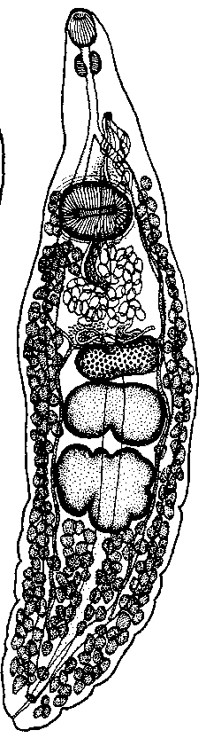 Ротовая присоска субтерминальная, 0,090—0,110 X 0,108—0,111 мм. Префаринкс явственно выражен; фаринкс 0,060—0,070 X 0,068—0,075 мм. Пищевод длиной 0,020—0,027 мм снабжен хорошо развитыми продольными мышечными волокнами. Кишечные стволы соединяются сзади и открываются анусом вентрально, на расстоянии 0,06—0,07 мм от заднего конца тела. Брюшная присоска, 0,17 мм в диаметре, располагается во второй шестой части длины тела; она снабжена шестью мало заметными сосочками (по три на переднем и заднем краях).