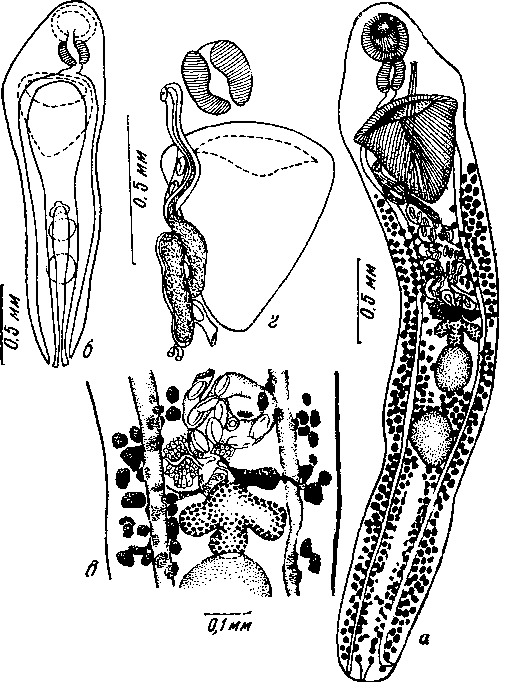 a — марита; б— экскреторная система; в — женский половой комплекс; г — концевая часть полового аппарата