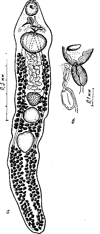 а - марита; 6 — концевой участок полового аппарата с фаринксом и ротовой присоской