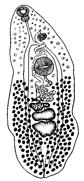 Желточники начинаются позади брюшной присоски. Половое отверстие расположено позади фаринкса впереди половой присоски.