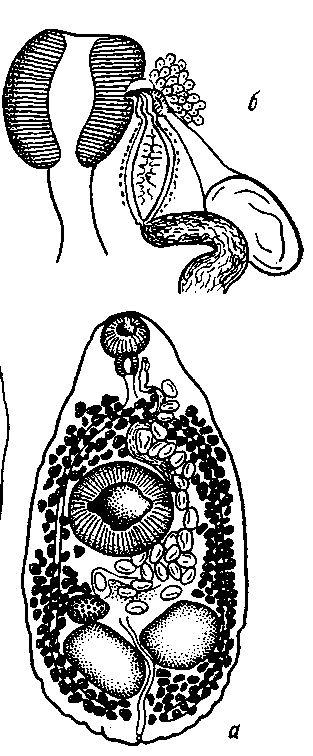a — марита; б — концевой участок полового аппарата и фаринкс