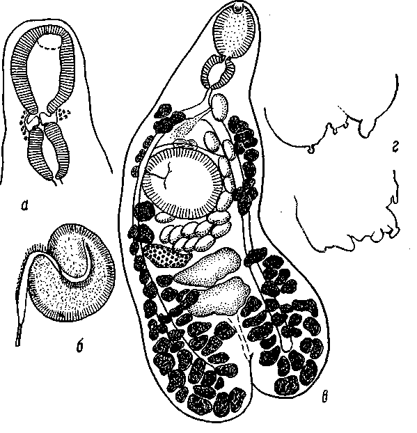 a — передний конец с дорзальной стороны; 6 — лопасти брюшной присоски; в — марита; г — сосочковидные выросты на заднем конце тела