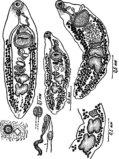 Мариты и детали строения их органов брюшная присоска в 2—3 раза крупнее ротовой, 0,226—0,495 мм в диаметре; она несколько вытянута в поперечном направлении и лежит на расстояний 1/4—1/6 длины тела от переднего конца. Тело образует глубокие складки, особенно выраженные в области брюшной присоски; на последней апальцевидных отростков или сосочков нет. Префаринкс очень короткий; пищевод длинный, обычно в два раза длиннее фаринкса; он раздваивается на небольшом расстоянии впереди брюшной присоски.