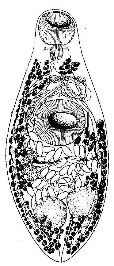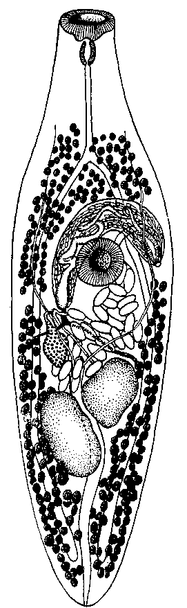 Почти грушевидный яичник, достигающий 0,12—0,17 мм длины и 0,066—0,11 мм ширины, располагается кнутри от правого кишечного ствола, между брюшной присоской и правым семенником.