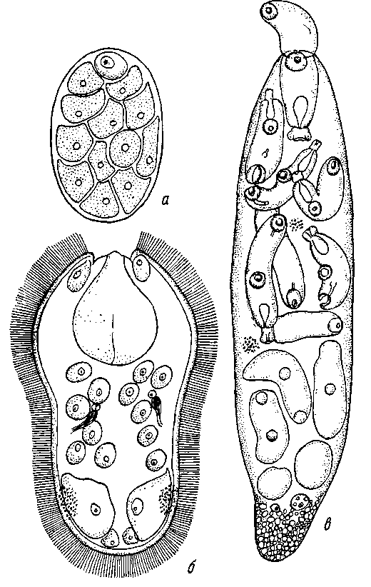 a — яйцо: б — мирацидий; в — спороциста