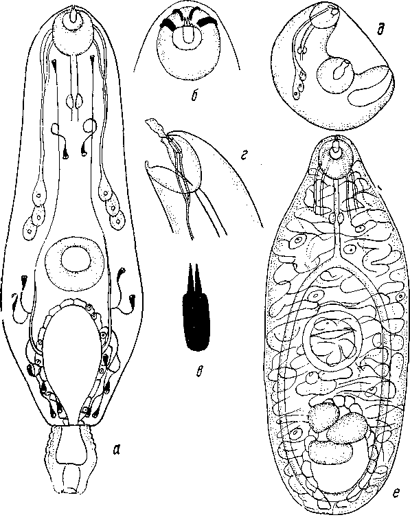 а — церкарий; б — аппарат проникновения с вентральной стороны; в — стилет; г — аппарат проникновения с латеральной стороны; д — инцистированный церкарий; е — метацеркарий