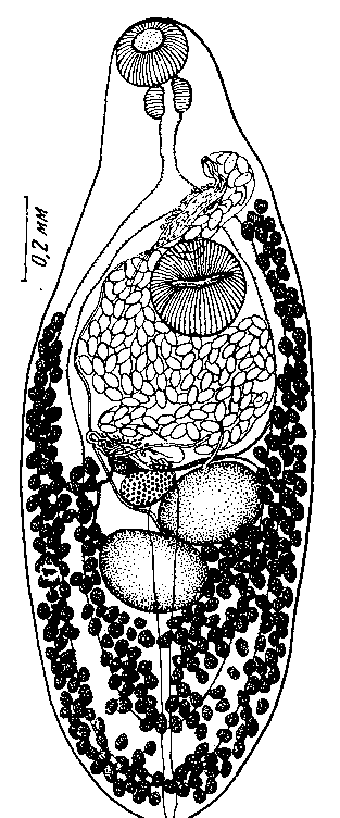 Описание вида (по Ямагути, 1940). Тело толстое, длина его 1,9 мм, ширина в области яичника и семенников 0,675 мм; передний конец тупо заострен, задний — скорее, округлый. Кутикула гладкая; наибольшая толщина ее на заднем конце тела равняется 0,005 мм. Ротовая присоска расположена почти терминально, размеры ее 0,15—0,17 мм. Префаринкс ясно выражен. Фаринкс 0,15—0,11 мм. Пищевод имеет длину 0,22 мм. Кишечные стволы соединяются ближе к заднему концу тела, чем к заднему семеннику. Брюшная присоска 0,225x0,238 мм, расположена на границе передней и средней третей тела, не имеет сосочков на своем свободном крае.