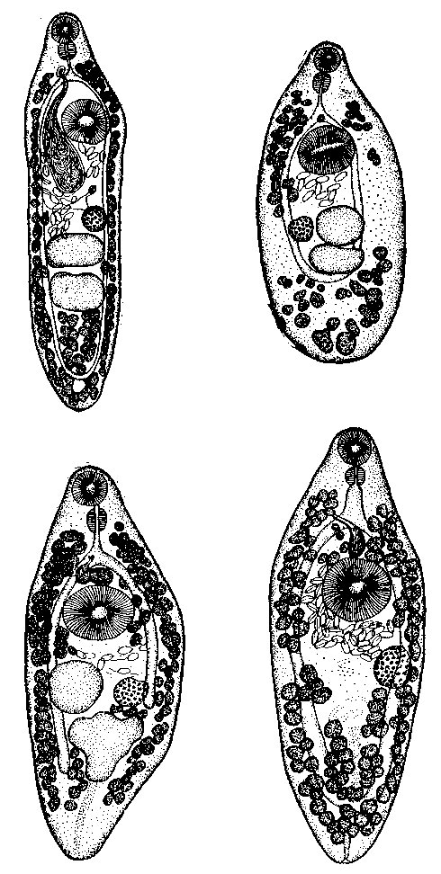 Субтерминальная ротовая присоска достигает 0,15 (0,118—0,219) мм в диаметре. Брюшная присоска, достигающая размера 0,22 (0,20—0,31) X 0,28 (0,24— 0,35) мм, имеет очертание овала, причем ее длинная ось перпендикулярна длинной оси тела. Обычно брюшная присоска располагается в центре тела или бывает слегка сдвинута по направлению к его переднему концу. Изредка она бывает слегка смещена кзади (у экземпляров с небольшим количеством яиц). Имеется короткий префаринкс (0,03 мм), за которым следует шарообразный фаринкс 0,11 мм в диаметре.
