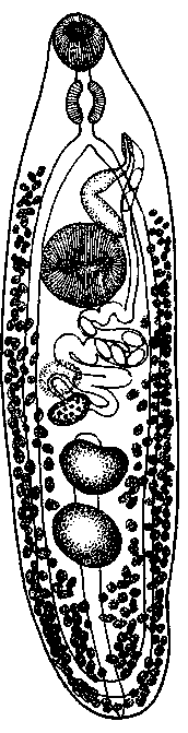 Экскреторный пузырь расположен дорзально, трубковидный, умеренно широкий, достигает заднего конца яичника.