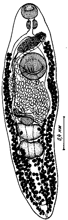 Яйца многочисленные, размеры их около 0,057 X 0,033 мм. Желточные фолликулы маленькие, начинаются с правой стороны — на уровне переднего края брюшной присоски, с левой стороны — непосредственно позади полового отверстия; желточники заходят немного в область между семенниками и занимают все возможное пространство позади заднего семенника. Желточный резервуар 0,1 X 0,045 мм, находится непосредственно позади тельца Мелиса.