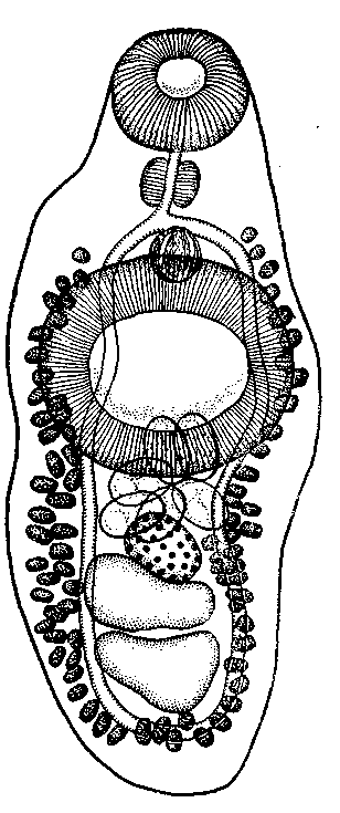Женское половое отверстие открывается справа от мужского. Семенники помещаются в задней половине тела, на половине расстояния между серединой тела и задним концом, медианно один позади другого или немного наискось друг к другу. Форма обоих семенников удлиненно-овальная, неправильно лопастная. Длина переднего семенника 0,28 —0,39 мм, а ширина — 0,108—0,130 мм; длина заднего 0,32—0,39 мм, а ширина 0,13 мм. Половая бурса овальной формы, мешковидная, занимает пространство между брюшной присоской, захватывая значительную часть верхнего края ее, и бифуркацией кишечника, до которого, однако, она не доходит. Половое отверстие открывается под развилком кишечника; размеры половой бурсы 0,130—0,174 мм.