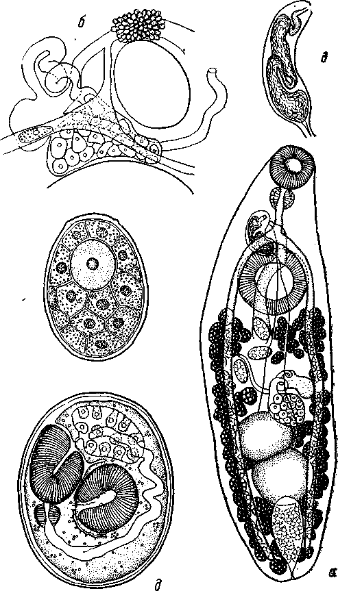 a — марита; 6 — женский поповой комплекс; в — половая бурса; г — яйцо; д — метацеркарий из Hyalella knicherbocheri
