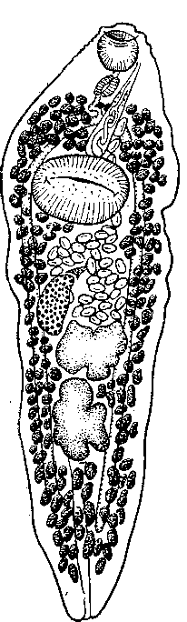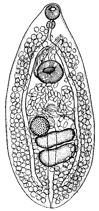 Желточные фолликулы крупные, проходят от заднего края фаринкса до места, находящегося на коротком расстоянии от заднего конца тела, непрерывные, дорзальные, латеральные и вентральные по отношению к кишечным стволам; сливаются дорзально и почти так же вентрально впереди брюшной присоски. Матка расположена частично влево от яичника, большей частью впереди него; размеры яиц 0,076 X 0,042 мм. Экскреторное отверстие терминальное; экскреторный пузырь можно проследить лишь до заднего семенника.