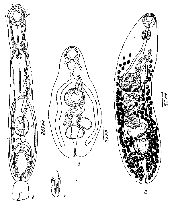 a — марита; б — метацеркарий; в — церкарий; г — стилет церкария