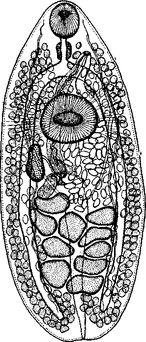 Тельце Мелиса располагается слева, дорзально по отношению к заднему концу половой бурсы. Матка лежит между передними семенниками и брюшной присоской. Метратерм хорошо дифференцирован; его дистальная часть проходит параллельно половой бурсе. Яйца немногочисленны, овальной формы, светло-коричневого цвета, имеют толстую оболочку, 0,054—0,066 X 0,034—0,045 мм. Желточники простираются от уровня фаринкса или пищевода до заднего конца тела, не прерываясь против брюшной присоски, проходя дорзально через половую бурсу между кишечной бифуркацией и брюшной присоской. Желточный резервуар лежит вентрально по отношению к переднему концу семяприемника. Экскреторный пузырь трубчатый, с дорзо-терминальным отверстием, раздваивается на уровне семяприемника.