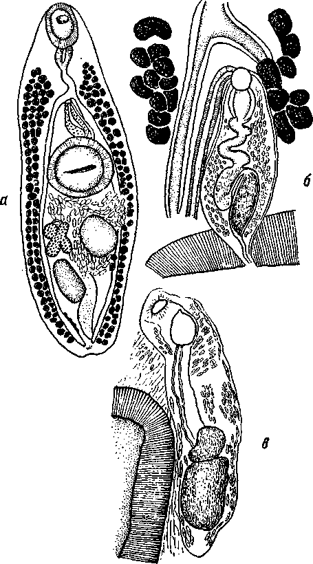 Свернутая плотными кольцами матка заключена между кишечными стволами впереди яичника.
