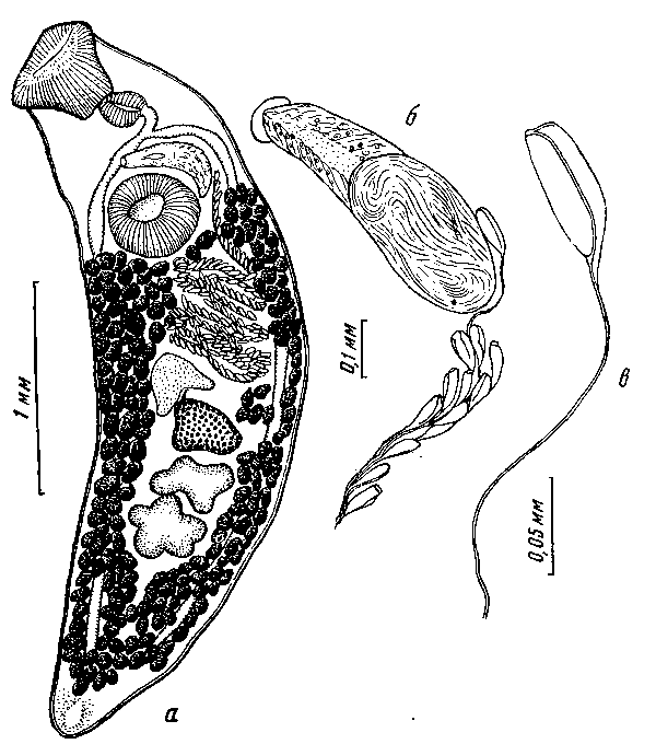 Форма семенников очень характерна. Край их образует небольшие лопасти; число лопастей переднего семенника Четыре, заднего — пять. Наибольший диаметр переднего семенника 0,31— 0,42 мм, заднего — 0,37—0,44 мм. Как видно из приведенных измерений, задний семенник всегда немного крупнее переднего.