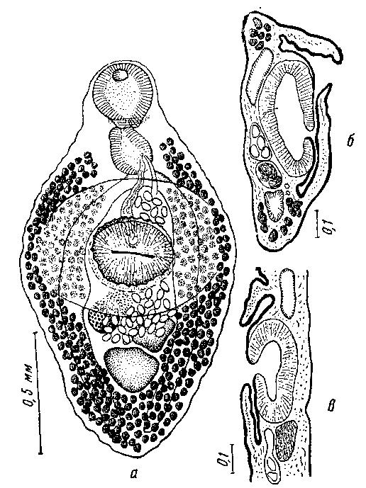 Пропорциональное соотношение присосок 1 : 2. Вентральная поверхность самой широкой части тела почти полностью заключена в крупную круглую складку стенки тела, которая оставляет отверстие против брюшной присоски приблизительно размером в брюшную присоску. Латеральные части этой складки не отделены от поверхности тела, но передний край, а часто и задний край ясно отмечены (этот интересный перекрывающий лоскут стенки тела является самой характерной чертой этого вида).