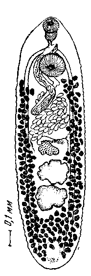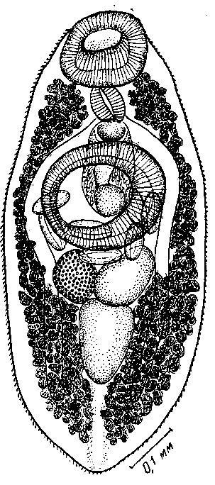 Желточники начинаются несколько кзади от заднего края брюшной присоски и простираются до заднего конца тела, где они сливаются по медианной линии тела. Петли матки располагаются между яичником и брюшной присоской. Метратерм прямой, своим задним концом заходит за брюшную присоску. Экскреторное отверстие располагается дорзально, на небольшом расстоянии от заднего конца тела. Экскреторный пузырь простирается кпереди от яичника. Яйца снабжены филаментом на одном из своих полюсов; они достигают 0,045—0,056 мм длины и 0,024— 0,027 мм ширины.