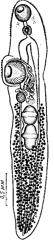 Семенники занимают среднюю треть длины тела, приближаясь к задней трети; они лежат между кишечными стволами один позади другого, с соприкасающимися полями и образуют 6—8 глубоких лопастей. Передний семенник прилегает к заднему краю яичника и достигает 0,840—1,225 X 0,862—1,277 мм, тогда как задний достигает 0,962—1,365 X 0,875—1,149 мм. Vasa efferentia проходят по обеим сторонам семенников. Семенной пузырек, достигающий 0,437—0,787 X 0,210—0,437 мм, лежит между брюшной присоской и семяприемником. Простатическая часть короткая; она пересекает брюшную присоску, оканчиваясь в гермафродитном протоке. Последний очень короткий, едва заметный, проходит вертикально по переднему краю брюшной присоски к половому отверстию.