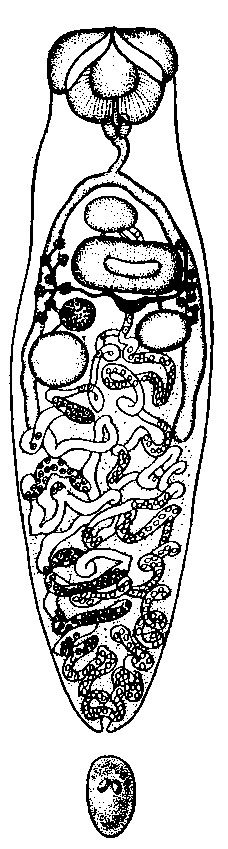 В промежутке между кишечными стволами они совершенно заполняют часть тела. Эллиптические яйца имеют тонкую скорлупу, покрытую толстой студенистой оболочкой. Зрелые яйца, на которых заметно глазное пятно мирацидия, имеют в длину 0,071—0,076 мм при ширине около 0,043 мм. Половое отверстие лежит медианно, под развилком кишечника. Маленькая, почти шарообразная половая бурса лежит впереди брюшной присоски; в ней заключены извитой короткий семенной пузырек, цилиндрическая простатическая часть и гладкостенный циррус умеренной длины. Метратерм простирается от полового отверстия до переднего края брюшной присоски.