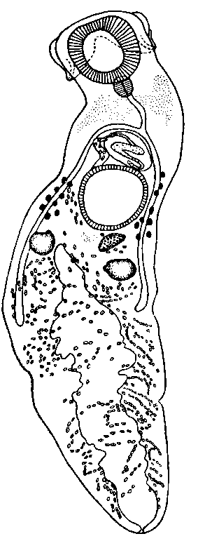 Шаровидный яичник сдвинут влево и лежит наискось позади брюшной присоски. На правом крае тела лежит передний семенник, а наискось от него, на левой стороне, расположен задний семенник. Семенники имеют шаровидную форму, их размер немного крупнее яичника. К внутренней стороне яичника прилегает маленький семяприемник. Желточники слабо развиты; они расположены по обе стороны брюшной присоски; их фолликулы шаровидной формы. Петли матки тянутся сперва к заднему концу тела, а затем поворачивают обратно и направляются к половому отверстию.