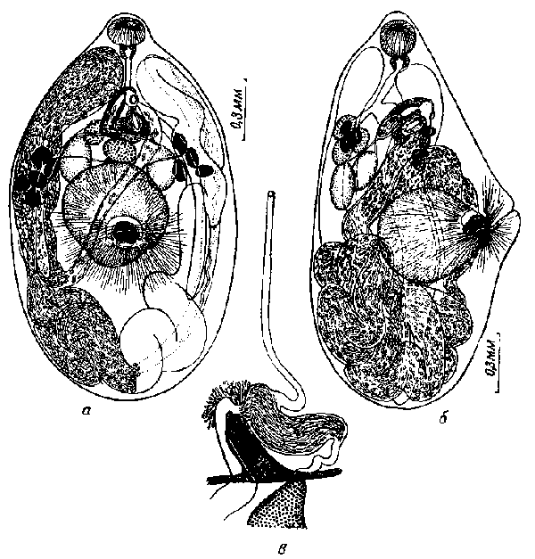 Он состоит из круговых мышечных волокон и снабжен центральной полостью, которая открывается в половой атриум. От основания этой полости отходит пальцевидный вырост, достигающий 0,07—0,09 мм длины при ширине 0,012 — 0,020 мм. Он входит на некоторое расстояние в половой атриум и состоит из чрезвычайно тонких продольных мышечных волокон. Вокруг заднего конца этого мешка, особенно позади него, имеется компактная масса веретенообразных железистых клеток, которые, сближаясь, направлены к основанию пальцевидного выроста. Назначение этого мешка невыяснено, но, судя по его строению и по положению, надо полагать, что он является дополнительным половым аппаратом.
