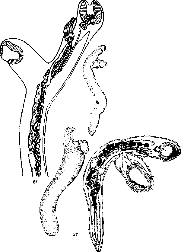 Рис. 28. Accacladium serpentulum Odhner, 1928 (Синоним: Distomum nigroflavum Monticelli, 1893, nec Rud., 1819 (по Монтичелли, 1893) [по мнению Однера (1928), желточники изображены неправильно]