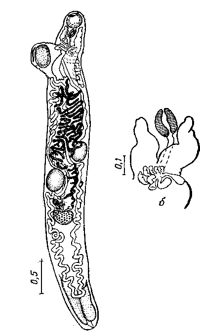 а — марита; 6 — передние концы кишечных стволов и девять кишечных дивертикулов