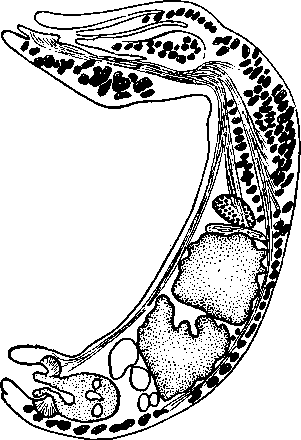 Дорзальный пучок подходит к половому атриуму и возле его передней стенки распадается на отдельные фибриллы, концы которых теряются в паренхиме. Вентральный мышечный пучок, по-видимому, является антагонистом дорзального. У диплостоматид (по Краузе) сильные мышечные пучки проходят вдоль медианной части органа Брандеса. Часть волокон идет по бокам этого органа и, достигнув заднего сегмента, образует вентральную связку. У своеобразной диплостоматиды— Harwardia sandgroundi латеральные пучки мышц, приближаясь к заднему сегменту, распадаются на пучок отдельных волокон, которые и проникают в паренхиму заднего сегмента.
