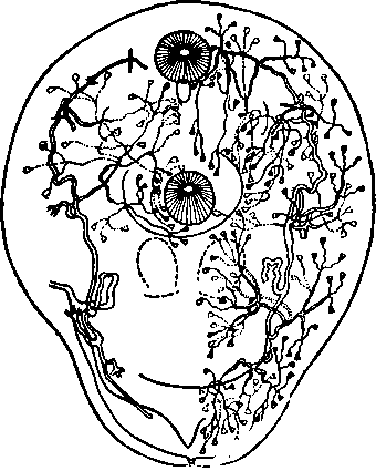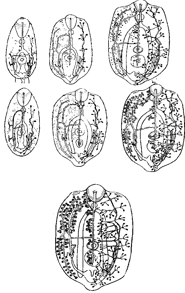 Эти ответвления встречаются у всех каналов, кроме латеральных, отходящих от экскреторного пузыря (общих для первичной и вторичной систем), и экваториальной комиссуры. На концах веточек образуются ампулы с известковыми тельцами внутри. Последние появляются у метацеркария на 18—23-й день с момента инвазии рыбы церкарием.