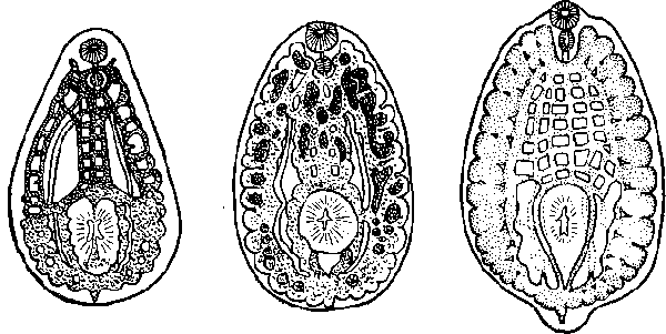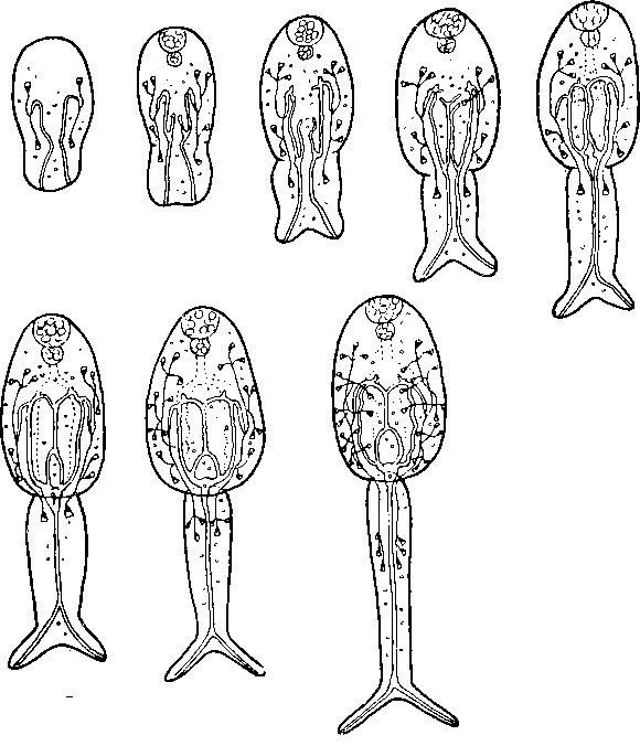 Paracoenogonimus viviparae (по Комия, 1938). Развитие вторичной экскреторной системы у метацеркария