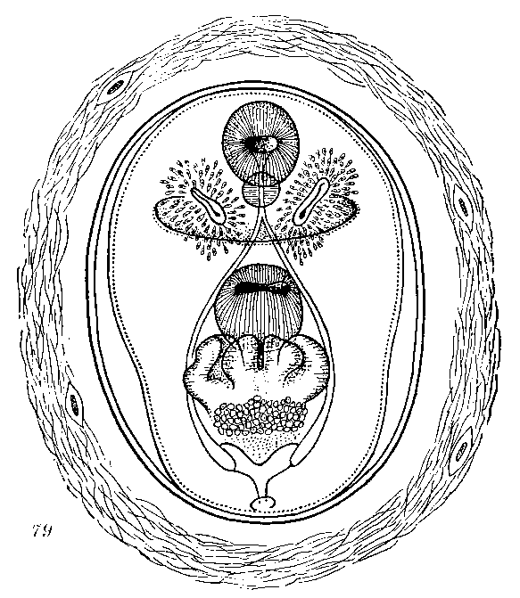 Strigea falconis Szidat, 1928 Метацеркарий из-под фасций мышц груди большой поганки (оригинал)