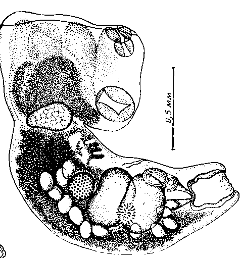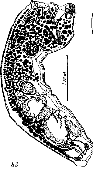 Ротовая присоска субтерминальная; ее размеры 0,129—0,140x0,130— 0,160 мм. К ней примыкает сферический фаринкс 0,079 мм длины и 0,058 мм ширины. Размеры брюшной присоски 0,228—0,264x0 216— 0,245 мм. Дольки протеолитических желез 0,172—0,223 мм длины и 0,176—0,198 мм ширины. Железы располагаются на расстоянии 0,028— 0,046 мм от заднего края брюшной присоски, вблизи межсегментарной границы.