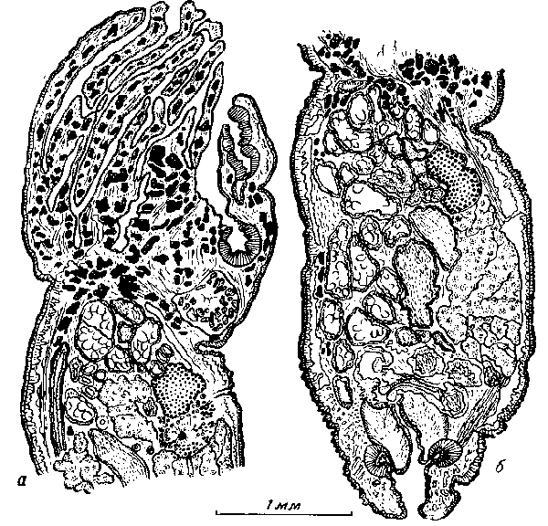 Сагиттальные срезы: a — через передний сегмент; б — через задний конец тела
