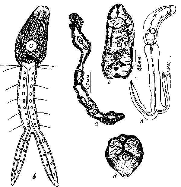 а — спороциста; б, в — церкарии; г — молодой метацеркарий; д — зрелый метацеркарий