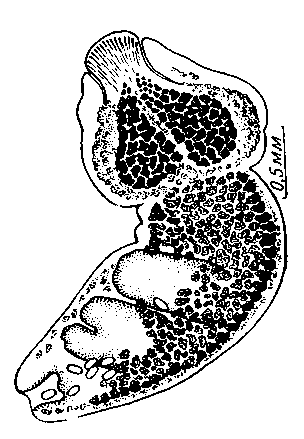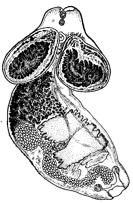Субтерминальная ротовая присоска 0,130—0,185 X 0,110—0,150 мм. Фаринкс 0,070—0,085 мм в диаметре. Он отделен от ротовой присоски коротким префаринксом. Брюшная присоска слабо развита и плохо видна на тотальных препаратах. На срезах ее размеры равны 0,140 х 0,115 мм. Орган Брандеса характеризуется наличием двух объемистых вздутий в основании дорзальной лопасти, занимающих почти все пространство полости переднего сегмента. Эти вздутия и определяют своеобразную форму переднего сегмента. У молодых экземпляров вздутия выражены значительно слабее. Размер протеолитических желез 0,20 х 0,12 мм. Они располагаются кпереди от межсегментарного сужения.