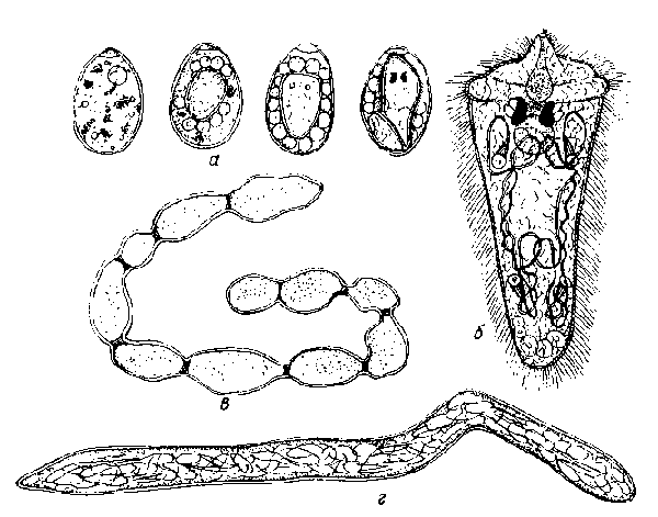 Стадии развития: a — развитие яйца; б — мирацидий; в — материнская спороциста; г — дочерняя спороциста