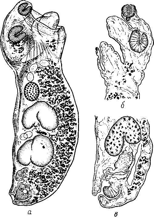 a — марита; б — передний конец тела (срез); в — срез заднего конца тела