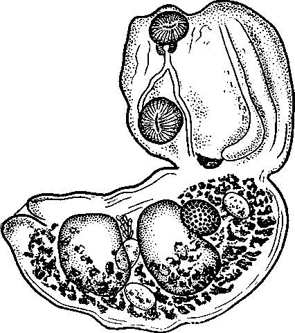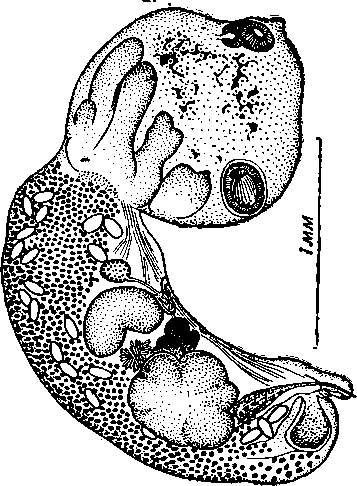 Передний семенник почковидный с выемкой на дорзальной стороне. Он достигает 0,236 мм длины и 0,467 мм ширины. Задний семенник крупнее переднего, лопастной, лежит на расстоянии 0,134 мм от переднего. Его длина 0,568 мм, ширина 0,467 мм. Дорзально от переднего семенника лежит небольшой семяприемник. Яйца многочисленные (13—21 экз. в матке), размером 0,117 X 0,066 мм. Восходящая петля матки почти достигает границы между сегментами. Гермафродитный канал открывается на вершине выступающего полового конуса, вен-тральнее которого лежит мышечный генитальный бульбус.
