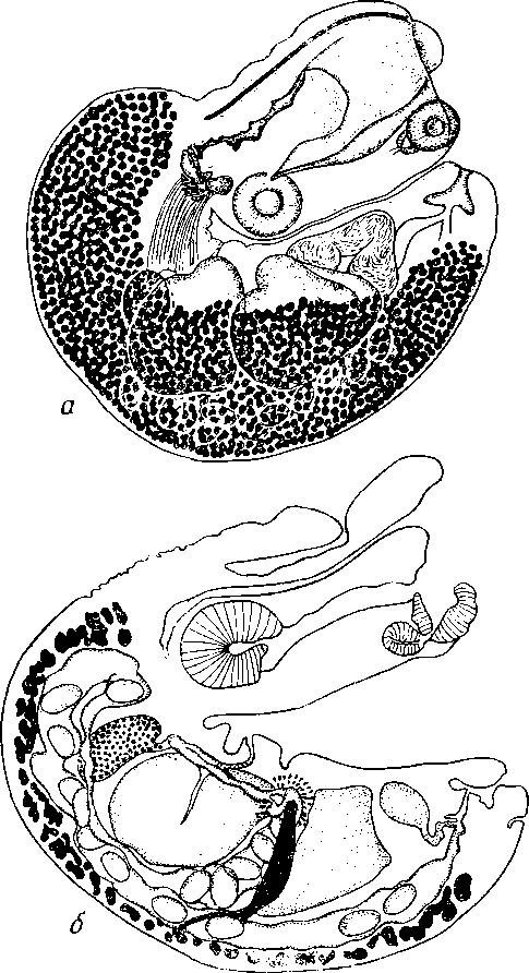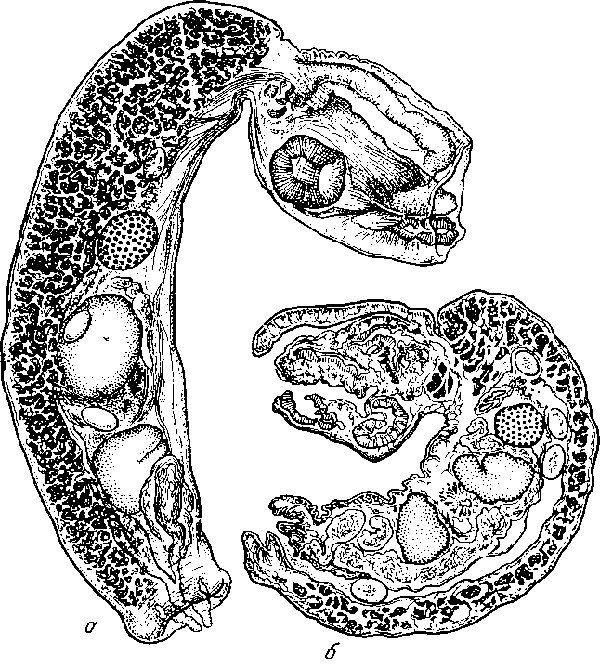 а - марига (по материалу Рудольфи); б — сагиттальный срез тела (по Дюбуа, 1938)