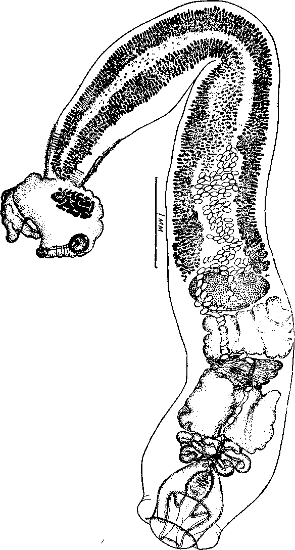 Семенники крупные, миоголопастные. Они расположены в последней четверти заднего сегмента, заполняя всю его ширину. Передний семенник размером 0,522—0,570 X 0,495—0,720 мм; размер заднего 0,630 X 0,550—0,720 мм. Глубина полового атриума 0,180—0,300 мм. Генитальный конус маленький 0,330—0,650 мм длины и 0,300—0,450 мм ширины. Он отчетливо отделен от паренхимы. Конус пронизан маткой, с которой в передней части конуса сливается семяизвергательный канал. Яйца многочисленные. Их длина равна 0,090—0,105 мм (по Сцидату, 0,10—0,11 мм) при ширине 0,060—0,072 мм.