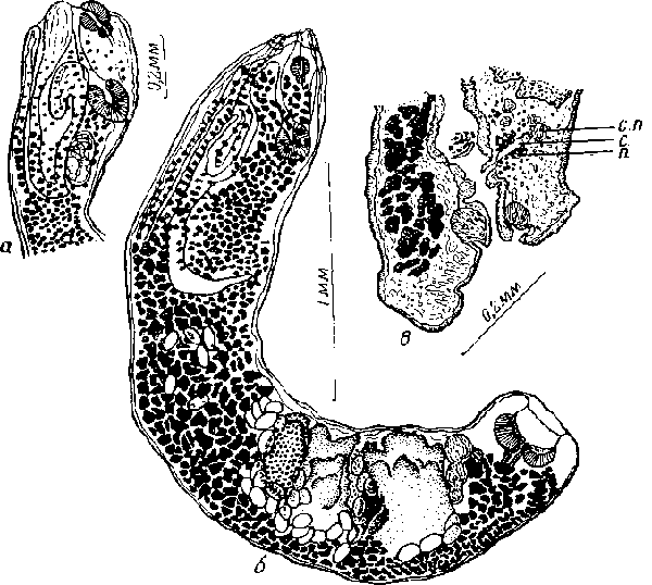 a — передний сегмент тела; б — общий вид мариты; в — продольный срез через задний конец тела