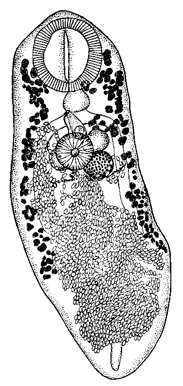 Грушевидная, относительно длинная половая бурса не заходит сзади за уровень центра брюшной присоски. Половое отверстие расположено медианно, или субмедианно, на уровне бифуркации кишечника или непосредственно впереди нее. Шаровидный или несколько овальный яичник, достигающий 0,075 X 0,1 мм, располагается непосредственно позади переднего семенника (в семи случаях из восьми яичник лежал справа). Желточники расположены вдоль кишечных стволов, между последними и латеральными краями тела, несколько налегая на кишечные стволы дорзально; спереди они достигают уровня полового отверстия, а сзади — уровня окончаний кишечных стволов или иногда заходят несколько за их границу.