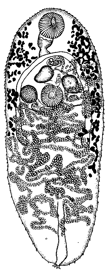 Половое отверстие располагается непосредственно позади бифуркации кишечника. Яичник округлый, расположен позади правого семенника, своим передним краем заходит на задний край брюшной присоски и достигает 0,130 мм в диаметре. Матка заполняет все пространство позади яичника, между кишечными ветвями и задним концом тела. Желточники фолликулярные; они тянутся по бокам тела, кнаружи от кишечника, от уровня середины ротовой присоски до концов кишечных ветвей. Яйца достигают 0,038—0,040 X 0,025—0,027 мм.