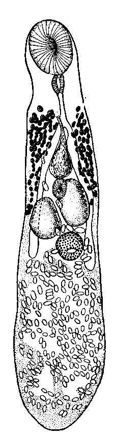 Нервная система состоит из двух ганглиев, расположенных по обеим сторонам заднего конца ротовой присоски; они соединены толстой поперечной комиссурой над дорзальной стороной фаринкса, от которой вперед и назад отходят тонкие нервы. Экскреторный пузырь трубчатый, несколько расширенный в своей задней части; он простирается вперед почти до тельца Мелиса и семяприемника, где образует два неглубоких кармана, в которые впадают два тонких главных канала. Округлые или овальные семенники расположены симметрично близ брюшной присоски; они достигают 0,195 мм в диаметре. Круглый яичник диаметром 0,163 мм лежит позади правого семенника. В некоторых случаях яичник бывает крупнее семенников, и тогда создается впечатление, что семенники еще не достигли нормального развития.