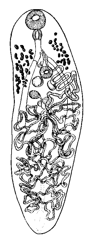 Кишечные ветви короткие, доходят только до середины длины тела, заканчиваясь немного позади яичника.