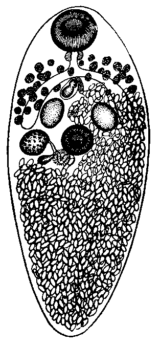 Половое отверстие расположено медианно, позади бифуркации кишечника. Половая бурса короткая, лежит наискось, впереди правого семенника; она достигает 0,09—0,012 х 0,06—0,08 мм. Яичник шаровидный, 0,12—0,13 мм в диаметре, расположен у правого края тела на уровне брюшной присоски. Петли матки лежат очень плотно, почти совершенно заполняя область тела позади брюшной присоски п огибая левый семенник. Желточные фолликулы сравнительно мелкие, округлые, довольно редко рассеяны вокруг кишечных стволов, преимущественно с их наружной стороны. Они сливаются на медианной линии тела.