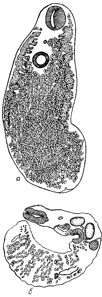 Восходящая ветвь матки идет извивами вентрально, между семенниками и половой бурсой, с одной стороны, и брюшной присоской — с другой; она открывается наружу позади отверстия цирруса. Яйца, очень многочисленные, достигают 0,060 X 0,048 мм. Желточники состоят из многочисленных, плотно сближенных фолликулов, расположенных по краям тела, почти до концов кишечных стволов; они лежат латерально от последних, окружая их. Спереди один желточник доходит почти до заднего края ротовой присоски, а другой доходит почти до ее переднего конца. Соединяющий оба желточника проток проходит немного позади тельца Мелиса.